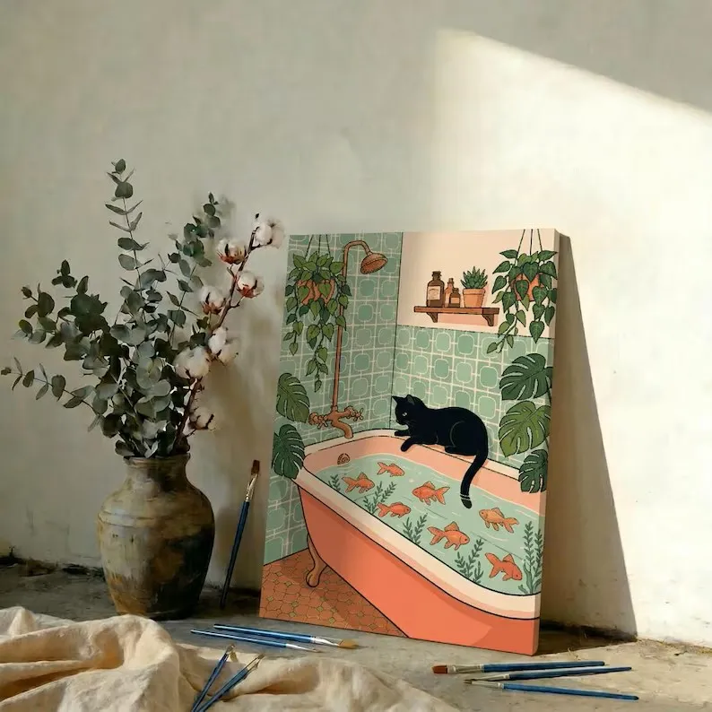 ✨🐈⬛ Black Cat Bathtub Bathroom Paint by Numbers Kit🌿 Turn quiet time into a playful, calming creative escape, and create a whimsical boho wall art piece perfect for your bathroom — no painting experience required!