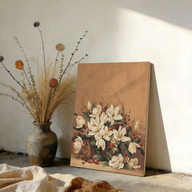 Turn your space into a warm vintage retreat with this Magnolia Floral Paint by Numbers Kit! Beginner-friendly DIY painting set for adults, perfect for relaxing creative hobby, elegant home wall decor, and thoughtful handmade gift.